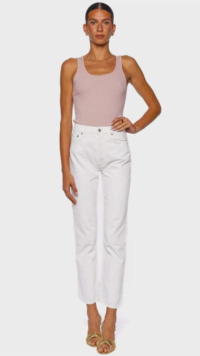 Embrace a timeless silhouette with these luxuriously crafted 90's Pinch Waist straight leg jeans in a pristine white wash. Designed from premium denim, they feature a flattering high-rise waist and a perfectly tailored cropped length for effortless sophistication. These jeans are the ultimate blend of vintage-inspired style and modern versatility, ideal for both elevated daytime looks and chic evening pairings. Style them with a fitted tank and strappy heels for an ensemble that radiates contemporary elegance.
