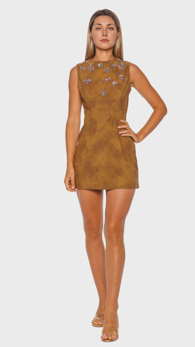 This luxurious mini dress showcases a figure-flattering A-line silhouette in a captivating amber hue. Delicate floral embellishments adorn the bodice, adding a touch of sophistication and sparkle. Perfect for upscale events, its sleeveless design offers an elegant and modern edge. Pair with strappy heels and subtle jewelry for an effortlessly chic ensemble.