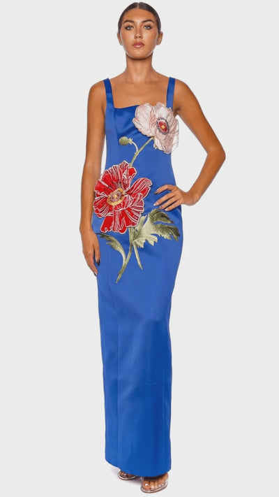 Experience unparalleled luxury with the Adelina Lapis Blue Maxi Dress, a statement piece adorned with exquisite floral embroidery. This form-fitting silhouette crafted in vibrant lapis blue flatters the figure, while the delicate straps and intricate detailing add a sophisticated touch. Ideal for upscale events, this dress captures the essence of elegance combined with trend-setting style for any special occasion.