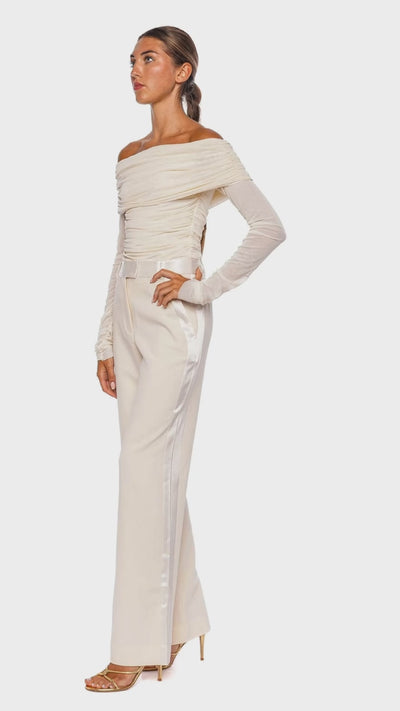 A tuxedo side panel pant, featuring contrast satin waistband, side panel and pockets