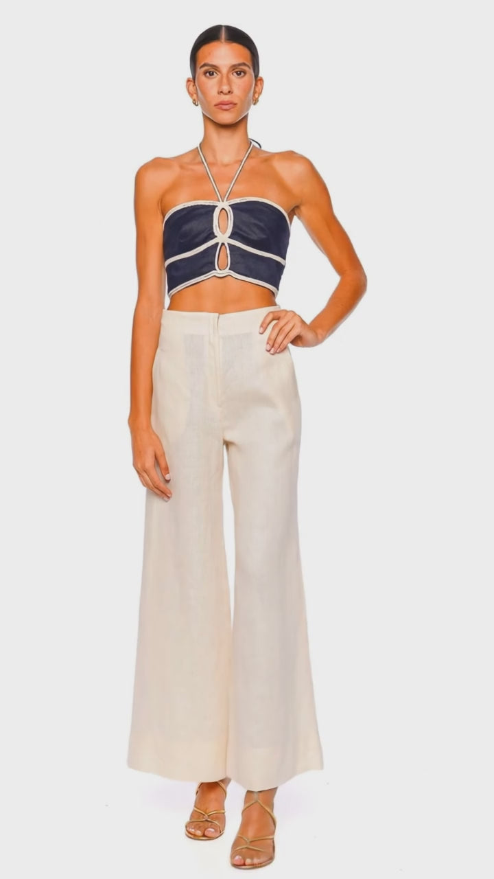 Elevate your wardrobe with the Agave Halter Cutout Cropped Top, featuring a captivating navy hue that exudes modern sophistication. Crafted with precision, this top showcases unique cut-outs and embroidery details along the alluring halter neckline that beautifully accentuates the shoulders. The luxurious fabric offers a perfect blend of comfort and style, making it a versatile addition to your collection. Pair it with high-waisted trousers and stiletto heels for an effortlessly chic ensemble.