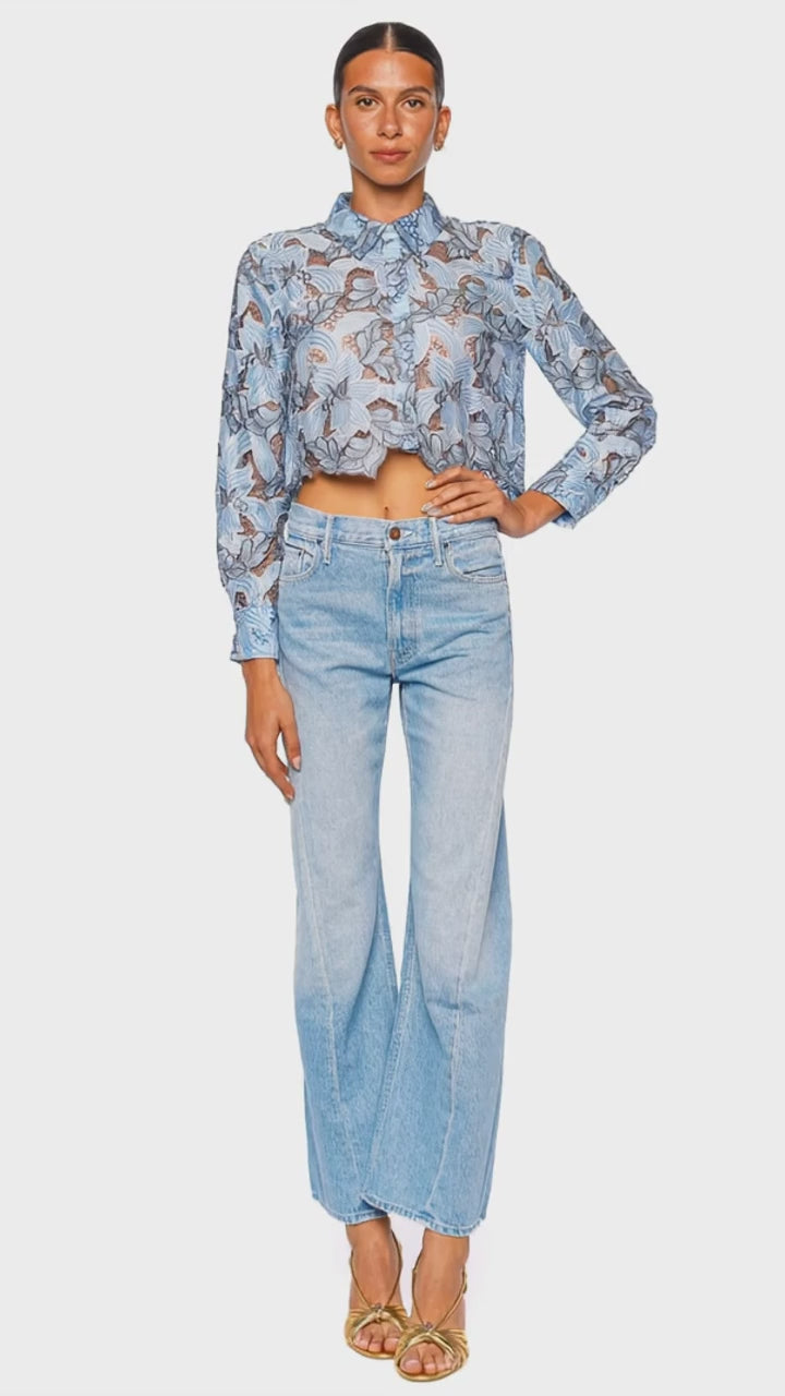 This striking cropped button-down top features exquisite blue multi-colored floral eyelet lace for a look that is both playful and sophisticated. The tailored collar and long sleeves add polish, while the scalloped hem and sheer finish exude modern femininity. Crafted from luxurious embroidered fabric, this piece is perfect for elevating denim or layering over a silk camisole for added allure. Style it with high-waisted jeans and metallic heels for a chic, trend-forward ensemble.