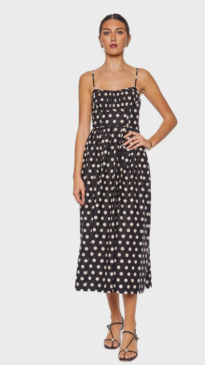 Embrace timeless elegance with the Joelle Dot Black Spaghetti Strap Midi Dress. Crafted from a sumptuous fabric, this dress features a classic polka dot pattern that exudes vintage charm. Its flattering silhouette and delicate spaghetti straps elevate this midi dress to a sophisticated choice for chic daytime gatherings or stylish evening soirées. Pair with strappy heels and minimalistic jewelry to complete your look with effortless finesse.