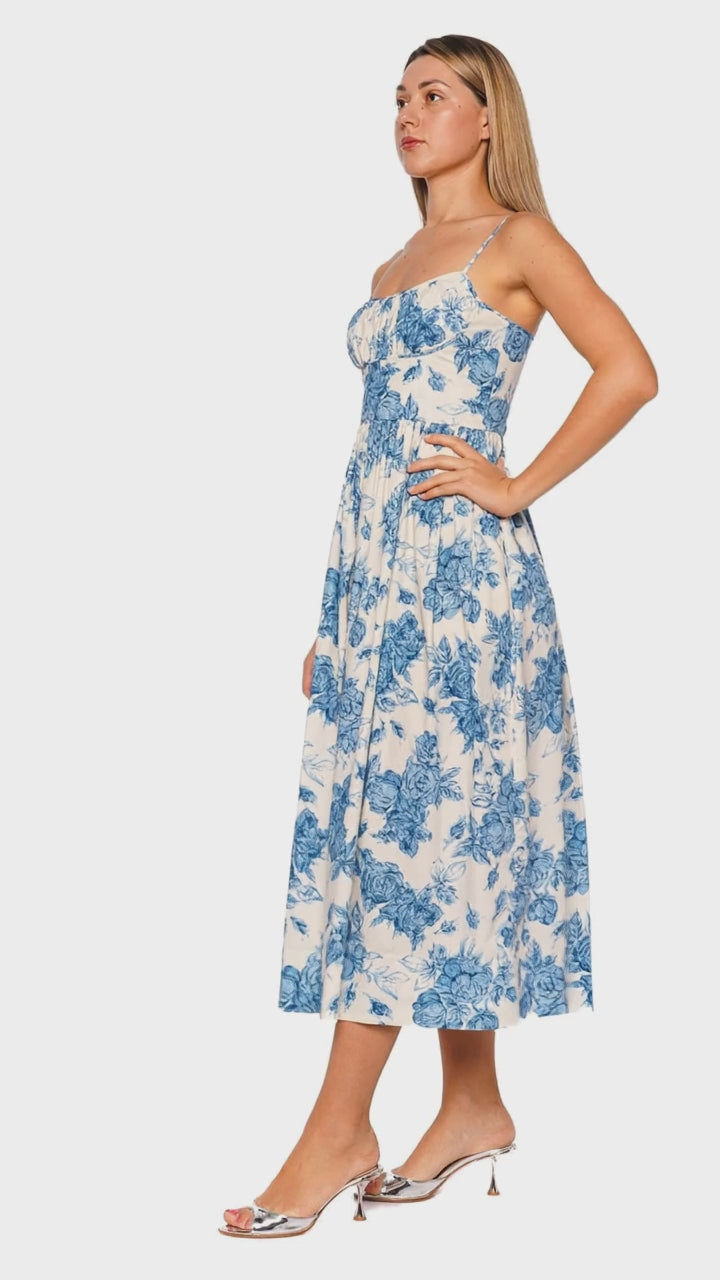 This Alba Tossed Floral Blue Midi Dress is the epitome of refined elegance with its gentle floral patterns and classic silhouette. Crafted from high-quality cotton poplin, it drapes gracefully, offering a soft, flowing feel that's ideal for both sunny daytime gatherings and sophisticated evening soirées. The delicate spaghetti straps add a touch of effortless elegance, making it a timeless wardrobe staple. Pair it with strappy sandals and a delicate clutch for a chic, polished appearance.
