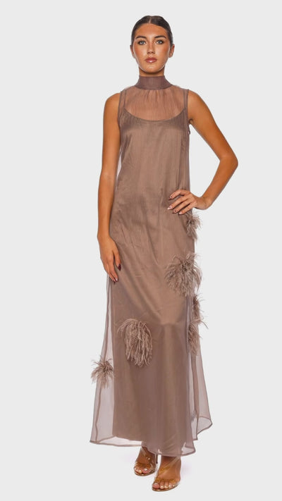 Albee Truffle High Neck Feathered Maxi Dress