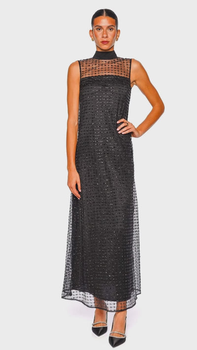 Channel your inner star with the Albee Stardust Onyx Sleeveless Maxi Dress, a masterpiece in luxury fashion. The delicate embellishments and sheer tulle overlay add a note of glamour and intrigue, perfect for evening occasions. Its floor-length elegance, combined with a sophisticated high neckline, ensures a dramatic, timeless silhouette. Pair with minimalist accessories and strappy heels to complete your chic evening outfit.