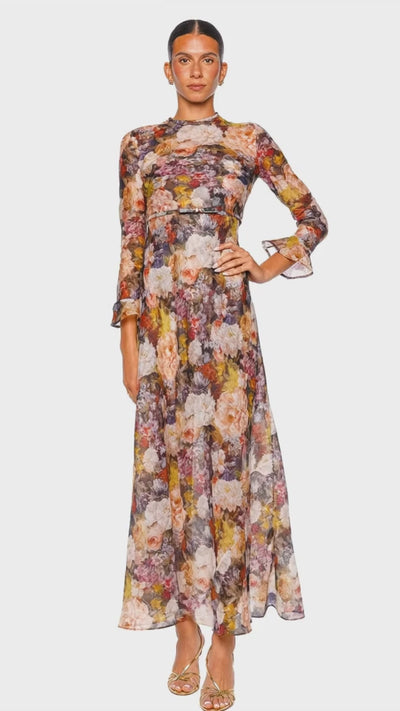 This ethereal maxi dress is designed in a richly layered rosette floral print with a refined sheath-inspired bodice and fluid skirt. The sheer long sleeves are finished with soft flared cuffs, while the high neckline and delicate embellished waist detail lend an elegant, couture-like finish. Crafted for elevated occasions, it moves beautifully with every step and delivers a romantic statement with polished sophistication. Style it with metallic heels and delicate jewelry for an effortlessly luxurious evening look.