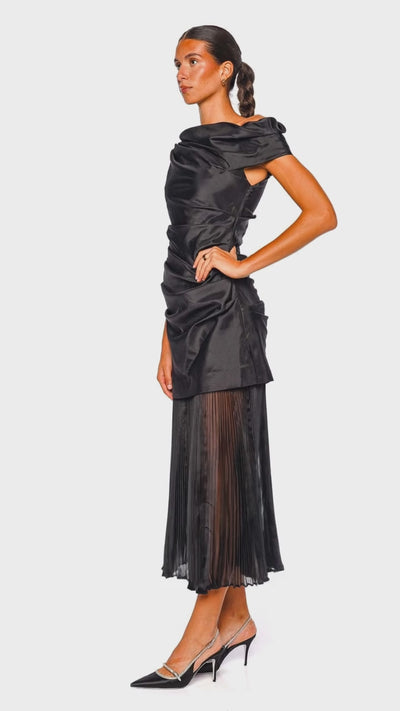Elevate your style with the Ammalie Black Off-Shoulder Combo Midi Dress, a stunning fusion of modern elegance and timeless allure. Crafted with an exquisite taffeta bodice that gracefully drapes off the shoulders, this dress effortlessly transitions into a sheer pleated organza midi skirt, creating a captivating silhouette. Perfect for elegant evenings or upscale events, this piece pairs beautifully with statement heels and refined accessories to exude ultimate sophistication.