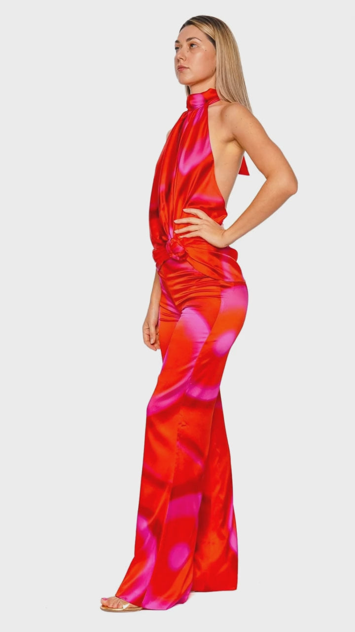 Exuding vibrant allure, the Andie Wide Leg Pants feature a striking orange abstract pattern that captures attention with every step. Crafted from high-quality fabric, these pants offer a fluid silhouette that drapes gracefully, enhancing movement and style. Perfect for those seeking a blend of bold fashion and comfort, they offer exceptional versatility for both daytime and evening events. Pair with a minimalist top and heels for a chic ensemble.