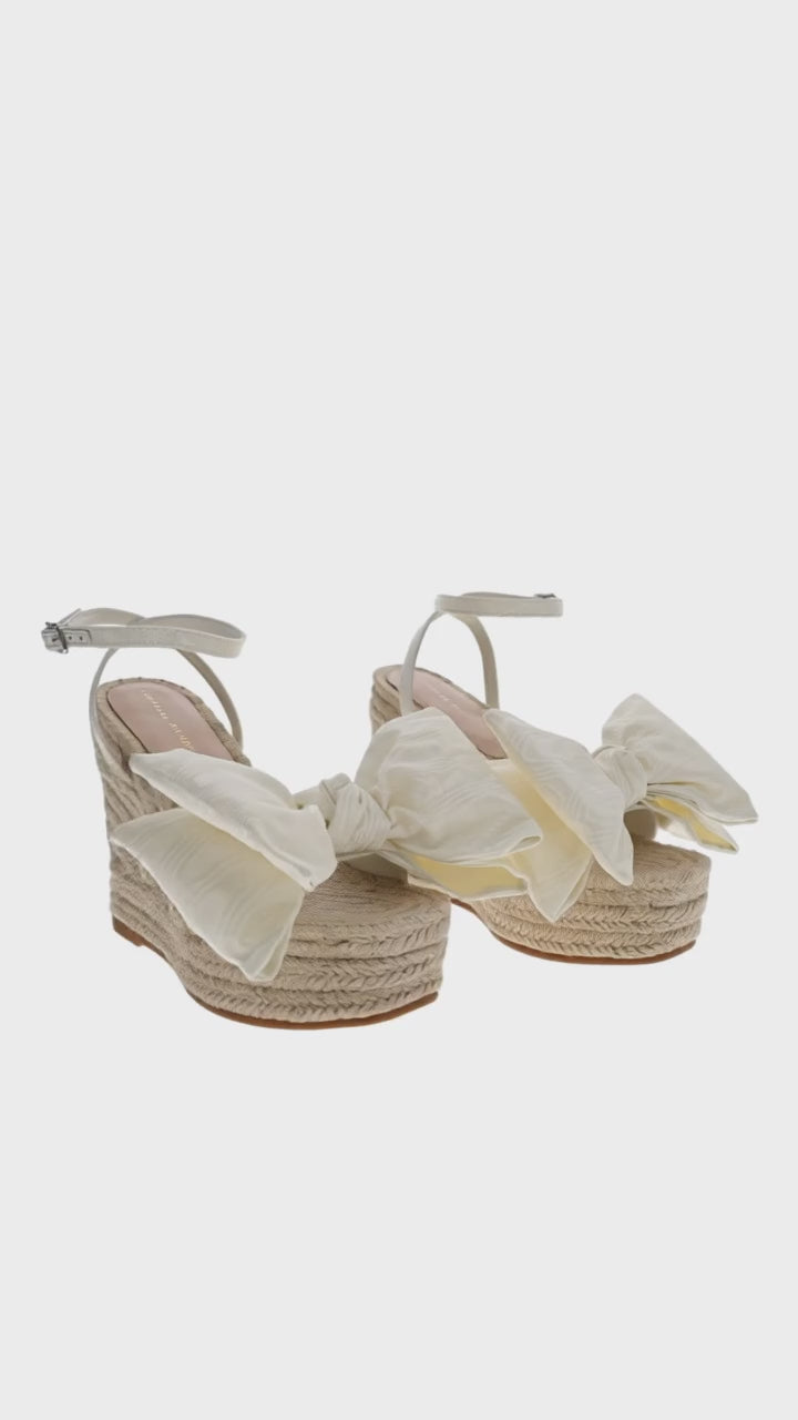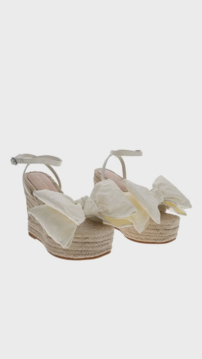 A platform wedge sandal crafted from natural jute, featuring an oversized bow detail and an adjustable ankle strap.