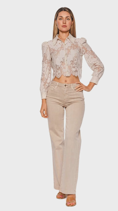 Elevate your ensemble with this sophisticated Anita Lace Button-Up Blouse, showcasing delicate champagne lace fabric in a chic, cropped silhouette. The intricate detailing and elegant puffed sleeves offer a romantic touch, perfect for both daytime elegance and evening allure. Style it with high-waisted trousers or a sleek pencil skirt to capture the essence of luxury fashion.