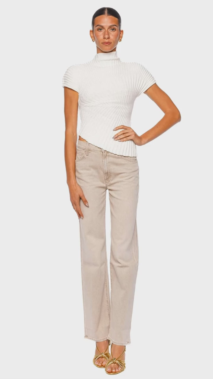 Elevate your wardrobe with this sculptural off white ribbed top, featuring a modern mock neckline and chic short sleeves. The luxurious knit fabric offers a flattering, body-skimming fit with an asymmetric hem for contemporary appeal. Perfectly balancing sophistication and trend, this top transitions seamlessly from day to night. Style with tailored trousers or high-waisted denim and strappy heels for an effortlessly polished look.