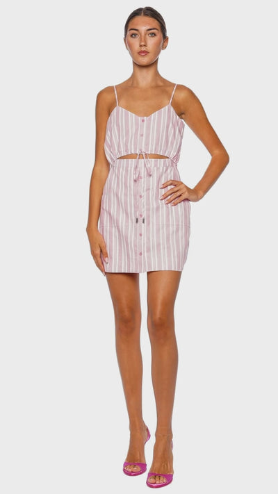 This striped mini dress features an drawstring waistband with cut out detail at the front, complete with a button down placket.