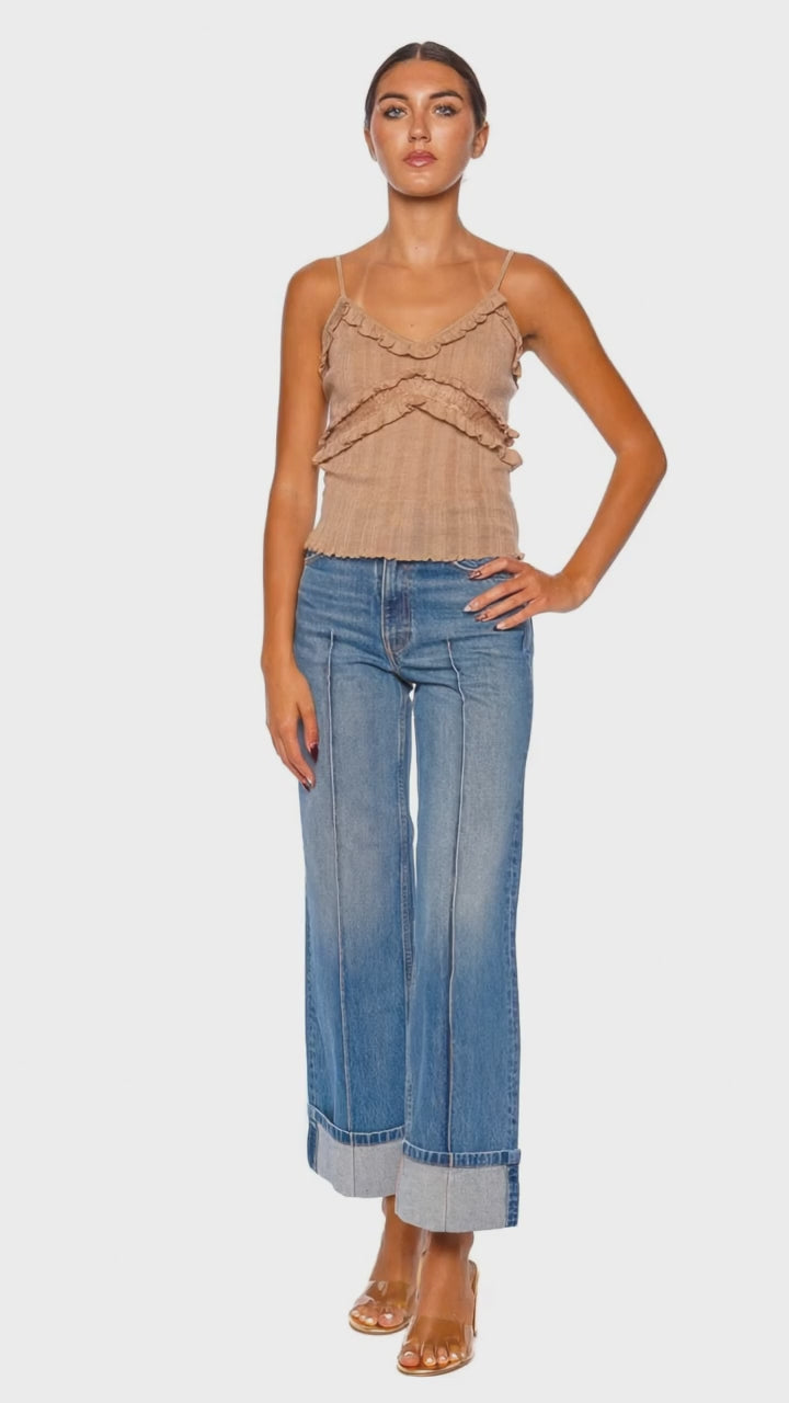 This elegant knit cami top in a rich camel melange hue is a stunning blend of comfort and style. Crafted with a soft knit fabric, it features delicate ruffle accents that infuse a touch of femininity. The versatile design is perfect for both casual outings and chic evening affairs. Pair it with high-waisted jeans and strappy sandals for a fashionable ensemble.