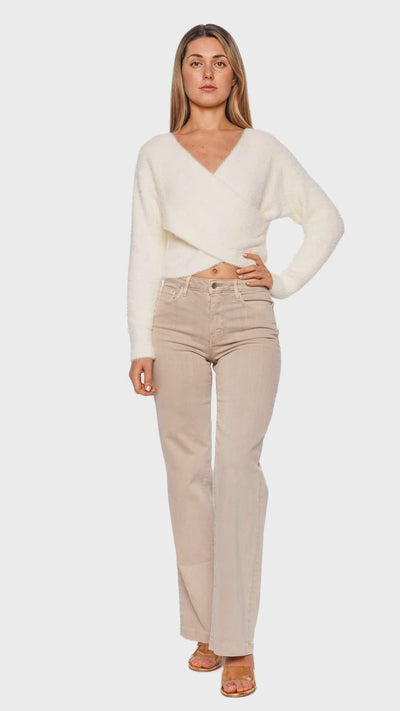 Elevate your wardrobe with this luxurious ivory pullover, crafted from a sumptuous knit that exudes sophistication and warmth. The surplus design wraps elegantly across the front, offering a modern and flattering silhouette that pairs perfectly with high-waisted denim. Its soft texture and impeccable construction make it a versatile piece, ideal for both casual and refined occasions. Combine with tailored trousers and statement accessories for a chic ensemble.