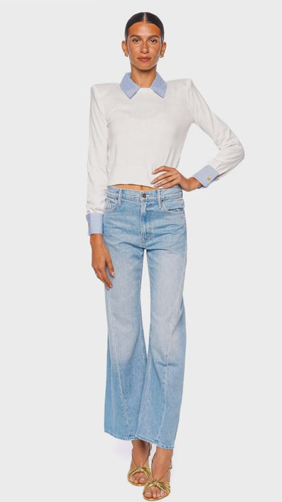 Elevate your essentials with this chic long sleeve top, featuring a crisp white body contrasted by a striking blue and white striped poplin collar and cuffs. Crafted from premium fabric, the tailored silhouette delivers a modern, polished look with a playful twist. The unique collar and cuff detailing infuse timeless sophistication, making this piece perfect for both office and casual refinement. Style it with high-waisted denim or tailored trousers for an effortlessly elegant ensemble.