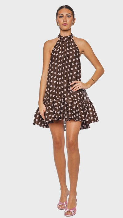 This Joelle Dot Brown Halter Mini Dress radiates whimsy and sophistication with its playful polka dot pattern and voluminous silhouette. Crafted from luxurious silk- linen fabric, it features a chic halter neckline that adds a touch of vintage elegance. The flouncy ruffled hem creates a playful movement, making it a delightful choice for both daytime outings and evening soirées. Pair it with minimalistic sandals and statement earrings for an effortlessly polished look.