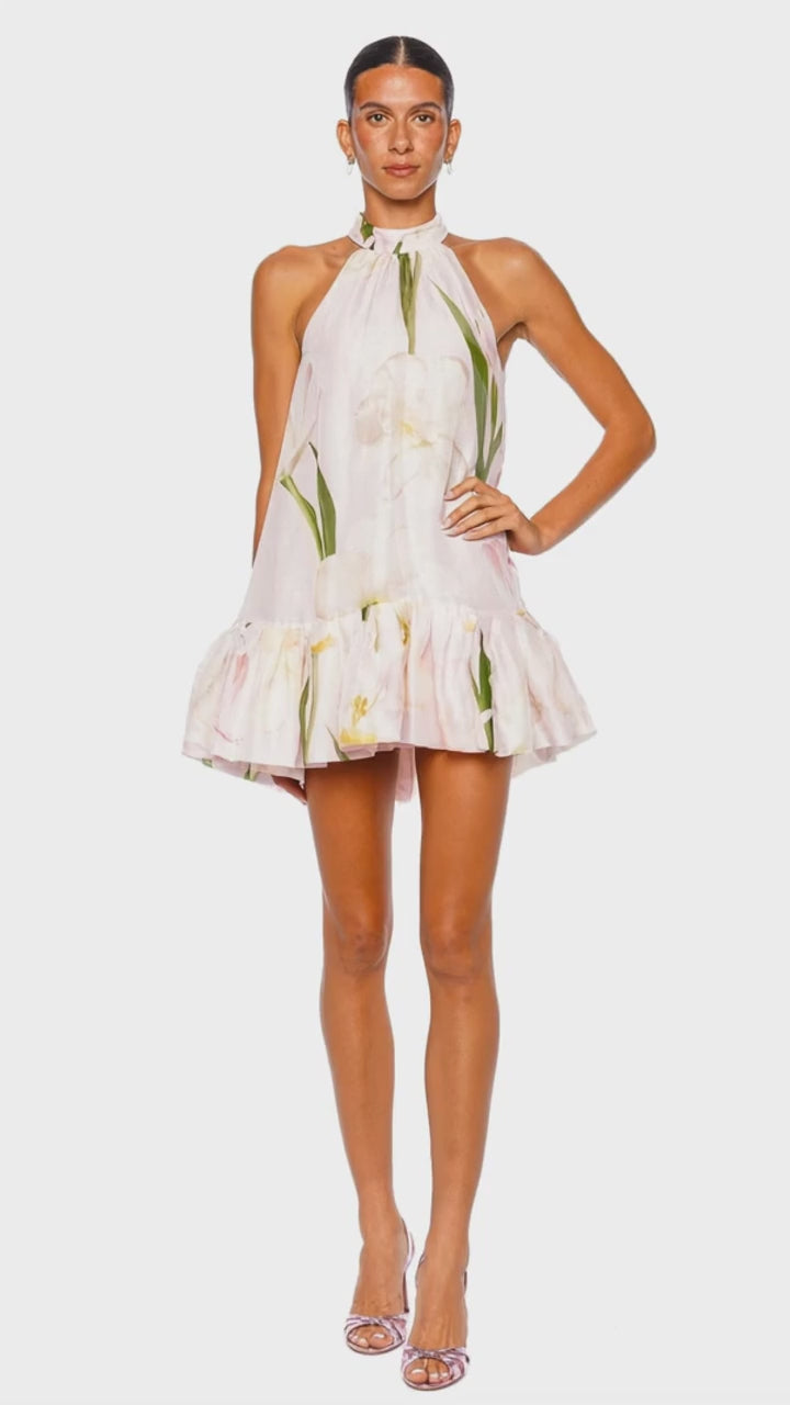 The Arca Mini Dress in Lillian Blush is a breezy, elevated statement with a soft floral wash and an effortlessly chic swing silhouette. Crafted in a lightweight, airy fabrication, it features a high halter neckline and a romantic tiered ruffle hem for beautiful movement. The mini length and subtle high-low finish create a modern, leg-lengthening effect that transitions seamlessly from daytime events to sunset cocktails. Style it with delicate heels and a sleek clutch for a polished, resort-ready finish.