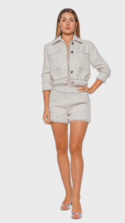 These Ashley Fringe shorts in a distinguished light blue and ivory chevron pattern evoke a sense of refined sophistication. Crafted from a luxurious wool blended fabric, they feature a playful fringe detail adding an avant-garde touch to a classic silhouette. Perfect for a chic daytime look or an elegant evening outfit, these shorts can be styled effortlessly with a matching jacket or a sleek top.