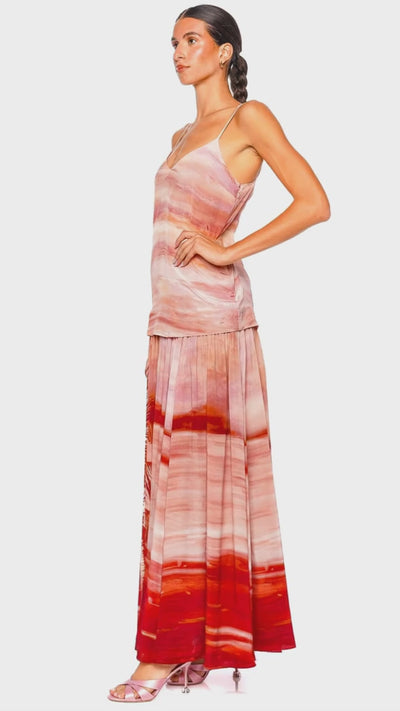 Embrace the captivating allure of the Asma Maxi Dress with its breathtaking multi-hued palette evoking a sunset sky. This dress features a graceful sweeping skirt with elegant pleats, complemented by a fluid silhouette that accentuates an effortless chic. Perfect for refined occasions or evening events, the lightweight fabric and delicate spaghetti straps provide both comfort and style. Pair with minimalistic heels and understated jewelry for a truly stunning appearance.