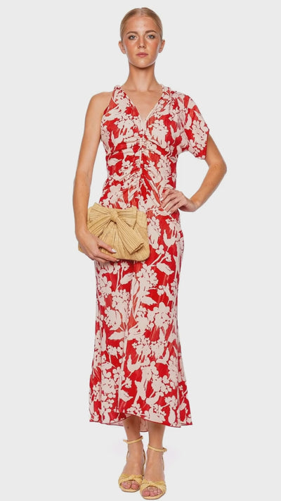 This floral midi dress features a twisted shoulder detail and asymmetric sleeves with ruched detail running down the front center.
