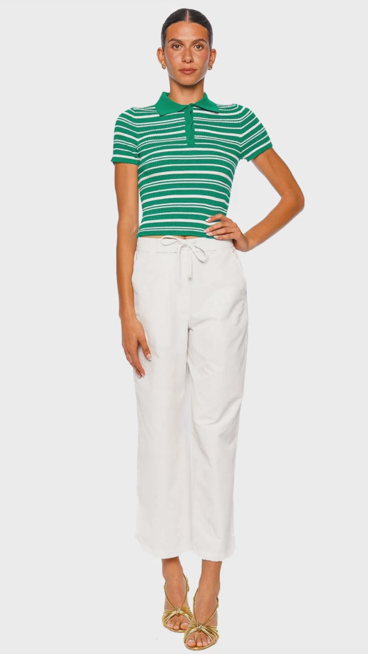 Infused with a modern, preppy charm, this knit polo top features vibrant kelly green and white stripes for a fresh, lively statement. The ribbed texture and tailored silhouette flatter the figure, while the classic collar and button placket lend a polished finish. Crafted from a sumptuously soft knit, this short sleeve top transitions effortlessly from casual outings to sophisticated gatherings. Pair it with high-waisted trousers or a sleek skirt for a refined daytime or evening look.