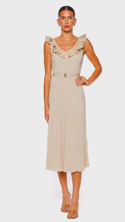 Awaken Metallic Gold Ruffled Knit Midi Dress