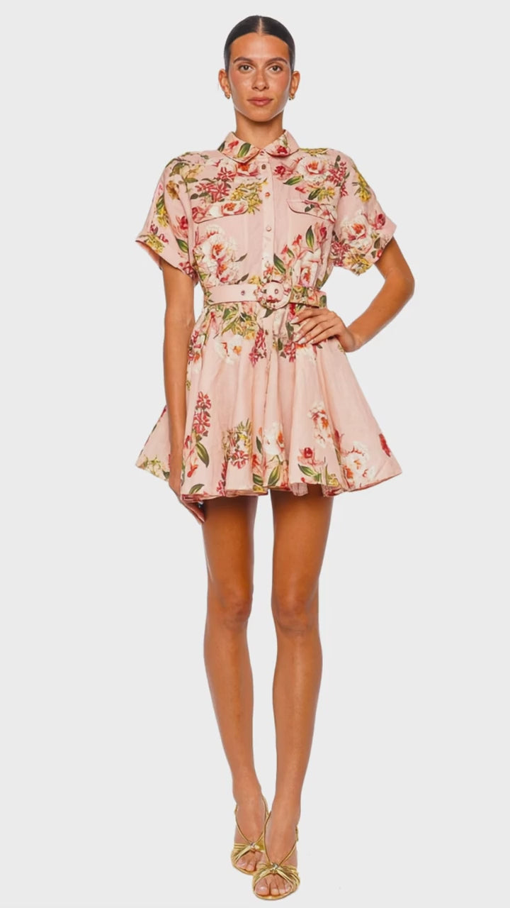 Ayla Peach Floral Belted Mini Shirt Dress