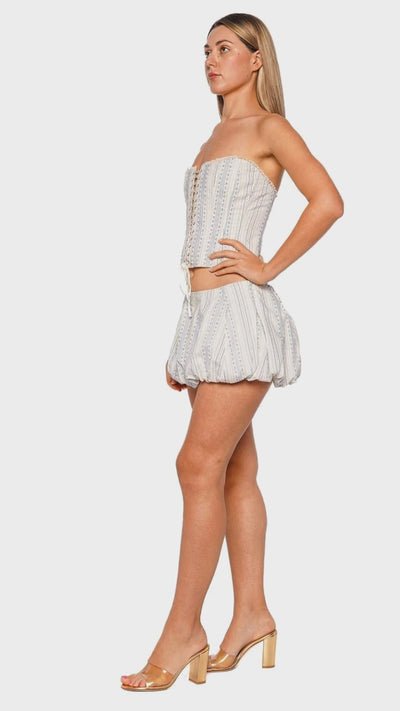 Experience refined luxury with this exquisite strapless crop top featuring a cinched silhouette and artisan-crafted lace-up front. The timeless blue stripe pattern and frilled lace trim infuses a touch of classic elegance, while the structured design ensures a flattering fit. Perfect for upscale occasions or an elegant day out, pair it with high-waisted trousers or the matching skirt for a cohesive look.