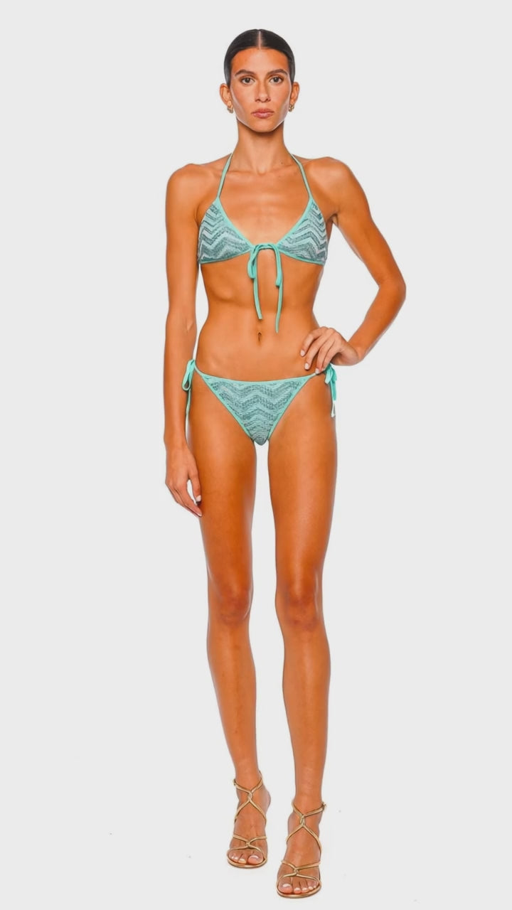 This striking aquamarine bikini features a chic halter neck and delicate tie details, perfect for sun-kissed beach days. The chevron pattern with sequin embellishments add a touch of modern sophistication, while the vibrant color ensures you stand out poolside. Crafted with premium materials, this bikini guarantees both comfort and style for the fashion-forward woman.