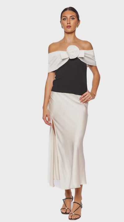 Exhibit a unique blend of elegance and modern style with this off-shoulder top, beautifully crafted in contrasting black and white crepe. The standout floral accent and impeccably draped shoulders showcase a touch of romantic allure, making it ideal for upscale gatherings. Pair it with a flowing midi skirt or tailored trousers to embody sophisticated charm.