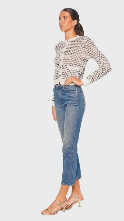 This exquisite cardigan features a refined buttoned design, offering a modern twist on a classic silhouette. Crafted from a soft, luxurious fabric, it's designed to elevate any ensemble with its delicate textures and pristine white hue. Perfect for layering, it transitions effortlessly from casual daytime looks to sophisticated evening outings. Team it with slim-fit jeans and strappy heels for a chic, polished appearance.