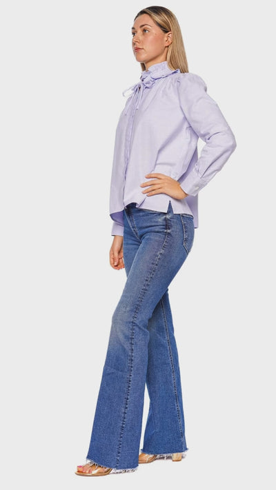 Elevate your wardrobe with this sophisticated Calista Frill Collar Shirt in an enchanting blue hue. The refined silhouette is perfected with long sleeves and an elegant frill collar, offering a touch of romantic charm to your ensemble. Crafted from lightweight oxford cotton, this top ensures both comfort and style, making it a versatile addition to your collection. Pair it with tailored trousers and heels for a chic, polished look.