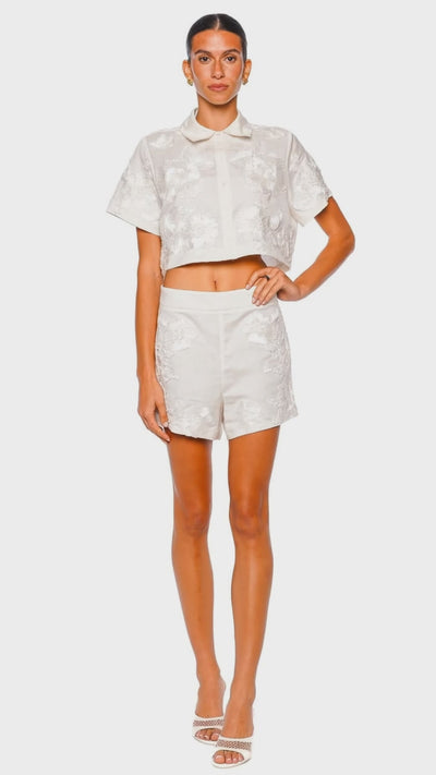 Elegance meets contemporary style in the Callie Ivory Short Sleeve Embroidered Camp Shirt. This shirt boasts intricate floral embroidery on a luxurious fabric, creating a sophisticated yet modern aesthetic. Perfect for warm weather occasions, its short sleeves and cropped silhouette make it an effortlessly stylish choice. Pair it with high-waisted shorts or tailored trousers for an elevated look.
