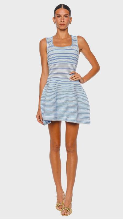 Radiate effortless charm in this Cally mini dress, crafted from a luxe knit fabric in a refreshing periwinkle multi stripe. The sleeveless silhouette and flattering square neckline create a modern, youthful allure, while the softly flared skirt adds playful movement to your look. Perfect for sun-drenched afternoons or chic daytime gatherings, this dress offers both comfort and sophistication. Style with strappy sandals and delicate gold jewelry for an elevated finish.