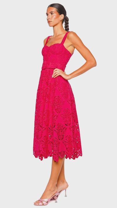 Step into the spotlight with this exquisite Azalea Eyelet Midi Dress, a masterpiece in intricate lacework and rich color. Crafted from premium fabrics, the dress showcases a captivating sleeveless silhouette with fixed straps for a secure fit. Perfectly capturing the essence of refined luxury, this dress is an elegant choice for both daytime and evening affairs. Pair with delicate jewelry and heels to complete your sophisticated ensemble.