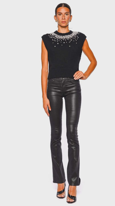 Elevate your wardrobe with this chic sleeveless vest, crafted to perfection with a luxurious black knit fabric. The standout feature is its richly embellished neckline, adorned with shimmering crystals and pearls, adding a touch of opulence to any outfit. This piece effortlessly marries understated elegance with contemporary flair, perfect for day-to-night transitions. Pair it with high-waist trousers or leather pants for a sophisticated silhouette.
