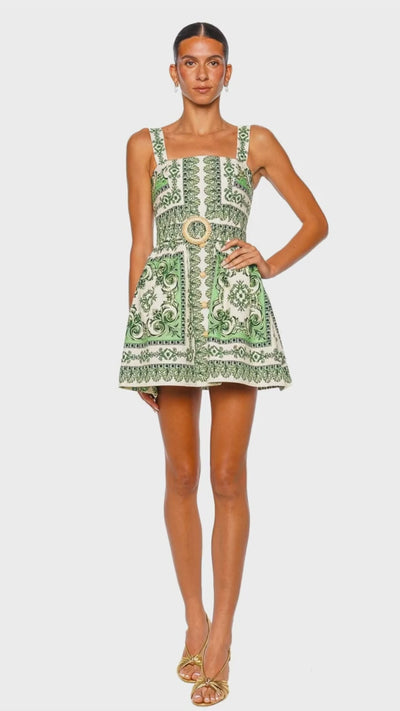 The Candy Mini Dress is a chic warm-weather statement in a fresh mint-and-ivory scarf print. Designed with a structured square neckline and wide straps, it skims the bodice before falling into a flirty A-line mini hem. A woven circle buckle belt cinches the waist for a polished, resort-luxe finish. Style it with metallic heels and a sleek clutch for an elevated brunch-to-evening look.