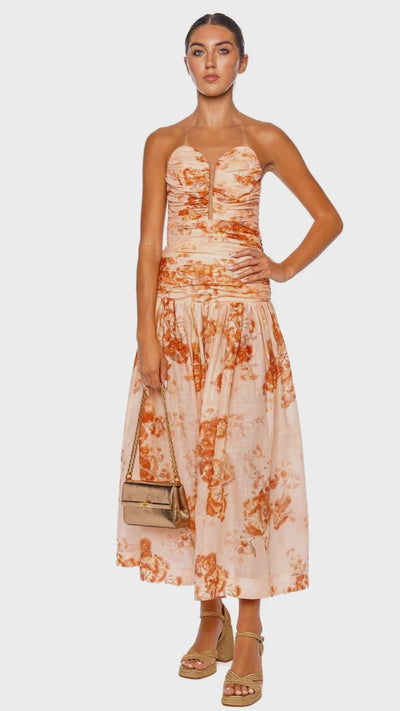 A cotton midi dress featuring a plunging V-neckline, gathered bodice and removable straps.