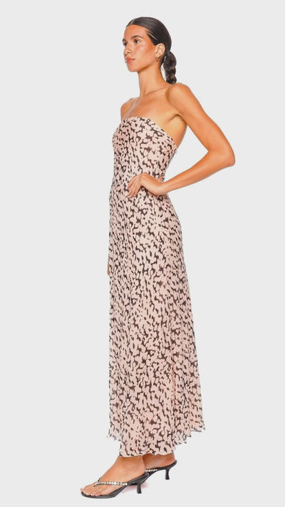 The Cassie Maxi Dress is a stunning example of sophisticated elegance, crafted from luxurious silk in an alluring almond and black print. This strapless design embraces a refined silhouette, making it ideal for both upscale daytime events and chic evening gatherings. The fluid fabric drapes beautifully, ensuring graceful movement and a flattering fit. Pair it with minimalist heels and statement earrings for an unforgettable look.