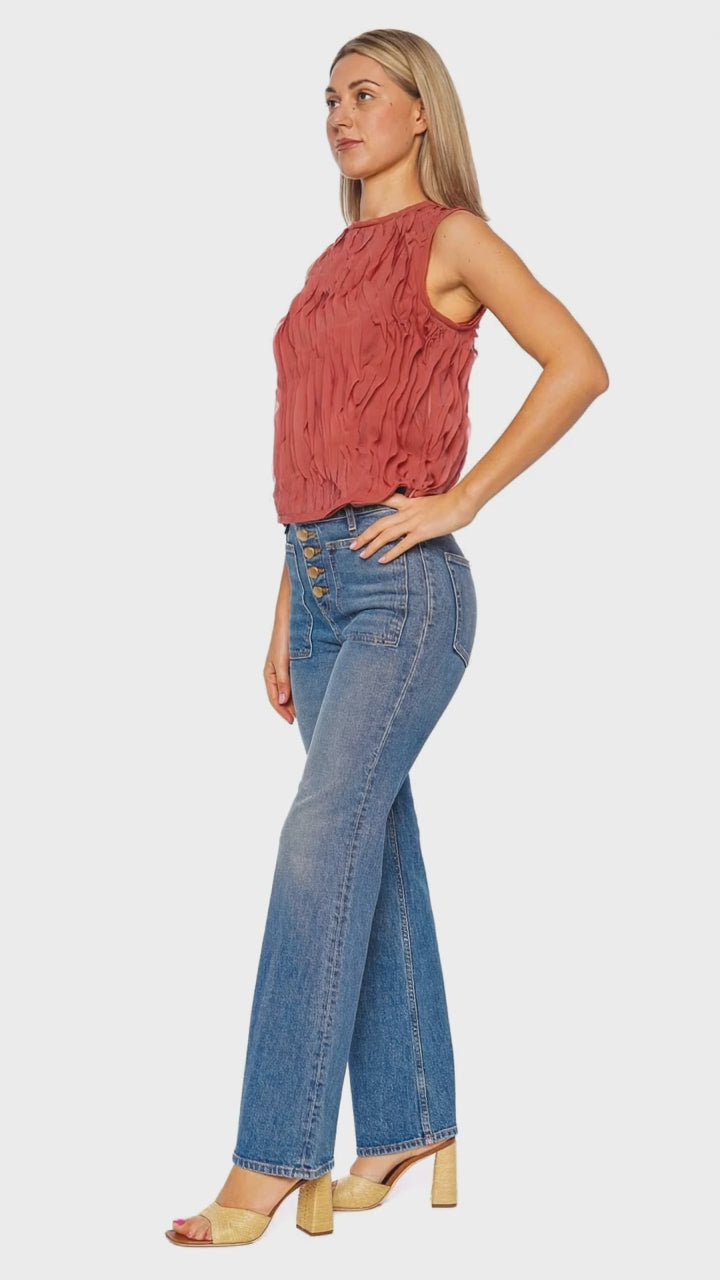 Elevate your wardrobe with the Celina Chestnut Sleeveless Ruffle Top, a statement piece that exudes contemporary elegance. Crafted from high-quality raw-edge chiffon, this top features a striking ruffle texture that adds dimension and sophistication to your ensemble. Perfect for pairing with high-waisted jeans or a sleek skirt, this piece easily transitions from day to night, showcasing a chic and modern aesthetic. Embrace effortless style and luxury with this versatile garment.