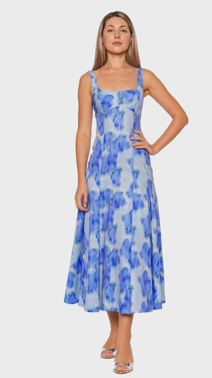 Embrace the essence of floral elegance with this Charlie Pleated Floral Blue Midi Dress, featuring a symphony of vivid blue hues. This exquisite piece combines a fitted bodice with a subtly flared skirt to create a flattering silhouette, perfect for any sophisticated gathering. The all-over floral pattern exudes a sense of timeless femininity, while the structured pleats add a touch of modernity. Elevate this ensemble with a pair of elegant heels and minimalist jewelry for an effortlessly chic look.