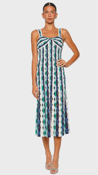 This striking knit midi dress features a vibrant Kelly green multi-color palette with vertical stripes and playful geometric cutouts, creating an eye-catching yet sophisticated silhouette. The contoured bodice with a twist-front detail and wide fixed straps offers both comfort and elevated style, making it a statement piece for any upscale occasion. Crafted from a luxurious, breathable knit, this dress transitions seamlessly from day to evening with a refined, modern edge. Pair it with metallic heels and minimalist jewelry for a chic, polished look.