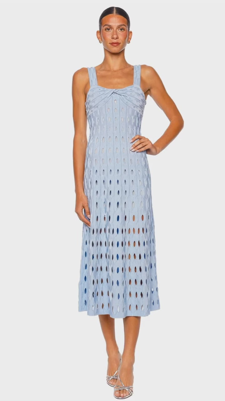 Elevate your style with this enchanting knit midi dress in a serene light blue hue, featuring a captivating openwork pattern throughout. The wide fixed straps and twisted bust detail add a sophisticated, modern touch, while the fitted bodice and gently flared skirt create an effortlessly elegant silhouette. Crafted from premium knit fabric, this piece exudes contemporary luxury and is perfect for standout moments from brunches to summer soirées. Pair with metallic heels and delicate jewelry for an elevated ensemble that commands attention.