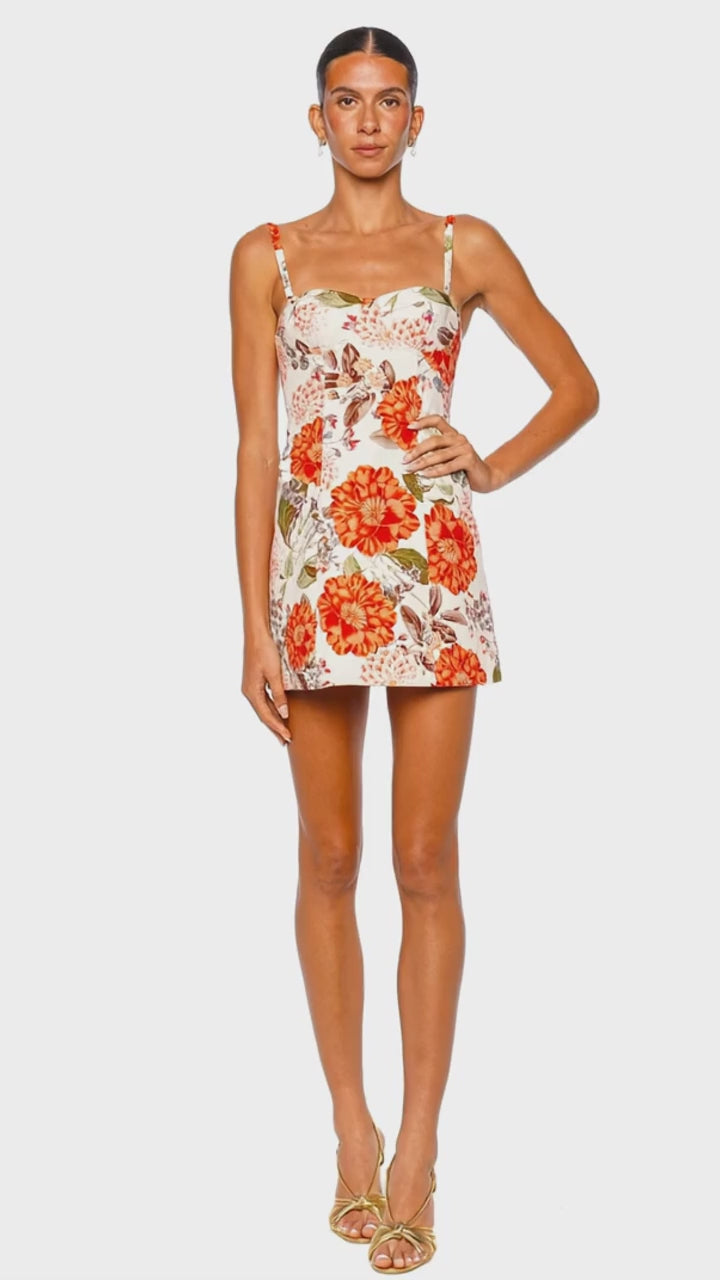 The Claudine Mini Dress in Egret is a sleek, fitted silhouette elevated by a vibrant blossom print that feels equal parts romantic and modern. Designed with a structured bodice and a softly shaped neckline, it creates a beautifully sculpted look with effortless polish. The crisp, luxe fabrication holds its form for a flawless finish from day events to sunset dinners. Style it with metallic heels and a petite clutch for an instantly elevated statement.
