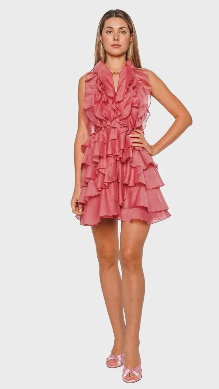 Embrace the allure of opulent texture with this Spiced Coral mini dress, adorned with cascading ruffles that bring dynamic movement and a touch of drama to your look. This sleeveless silhouette is crafted from a luxurious fabric that offers an exquisite sheen and elegant drape. Perfect for day to night transitions, its rich hue and intricate detailing embody a blend of modern sophistication and timeless femininity. Style with delicate gold accessories and strappy sandals for a captivating ensemble.