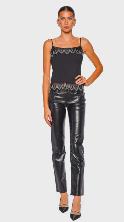 Elegantly designed, the Colette Black Top features intricate embellished tulle scalloped trim that exudes sophistication. The form-fitting silhouette enhances your curves while the spaghetti straps add a delicate touch of femininity. Perfect for refined eveningwear, this top is a stylish choice for making a statement at any event. Pair it with tailored leather pants and pointed heels for a striking, contemporary ensemble.