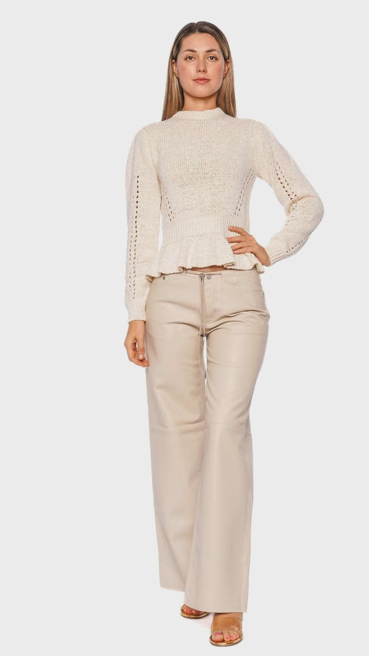 Cool Beige Leather Low Rise Wide Leg Pant