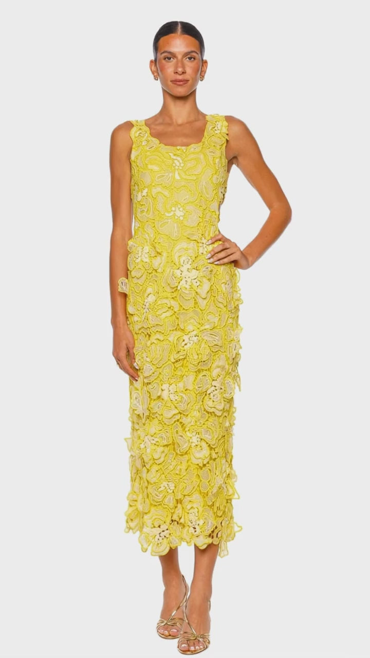 The Corinna dress is a striking expression of modern romance, crafted in intricate floral lace with a luminous buttercream multi palette. Its sleeveless midi silhouette is elevated by sculptural appliqué detailing, side cutouts, and a refined body-skimming fit that feels both feminine and fashion-forward. The textured lace overlay and artful finish lend this piece an unmistakably elevated presence for weddings, garden parties, and elegant evening occasions. Style it with metallic heels and delicate jewelry for a polished, luxe statement.
