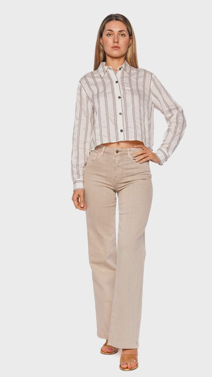This elegantly designed crop shirt features a stylish hi-low hem and a classic button-down front. Crafted from a lightweight fabric adorned with timeless ivory, khaki, and black stripes, it pairs sophisticatedly with both casual and dressy bottoms. The tailored silhouette and long sleeves add a touch of modern sophistication, making it the perfect piece for a chic, versatile wardrobe.